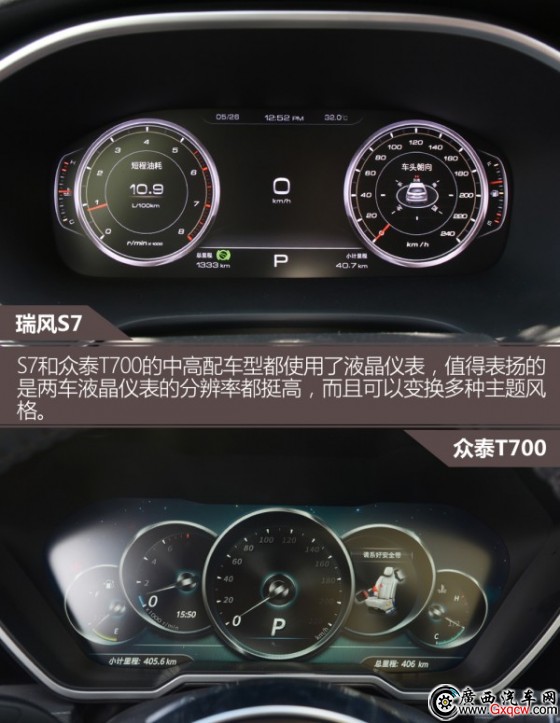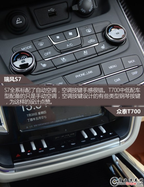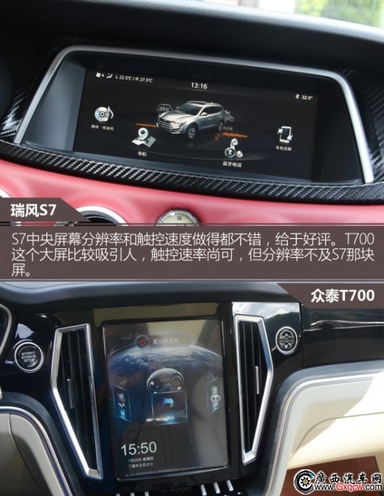 S7中央屏幕分辨率和觸控速度做得都不錯,給于好評。T700這個大屏比較吸引人,觸控速率尚可,但分辨率不及S7那塊屏。兩車多媒體配置都很齊全,影音播放、藍(lán)牙電話、導(dǎo)航、全景影像(高配)等都有配備,此外還都帶有手機(jī)互聯(lián)功能。