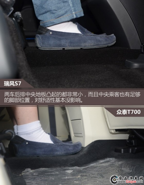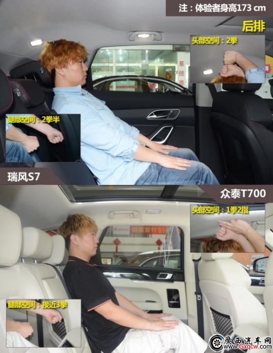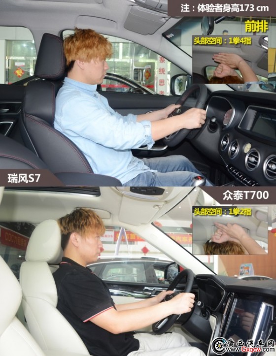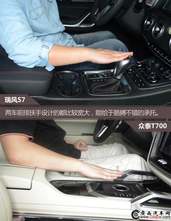 身高173cm體驗(yàn)者在瑞風(fēng)S7前排得到1拳4指的成績(jī),T700前排頭部空間為1拳1指,表現(xiàn)遜于S7。兩車前排扶手設(shè)計(jì)的都比較寬大,可以給于胳膊不錯(cuò)的承托。
