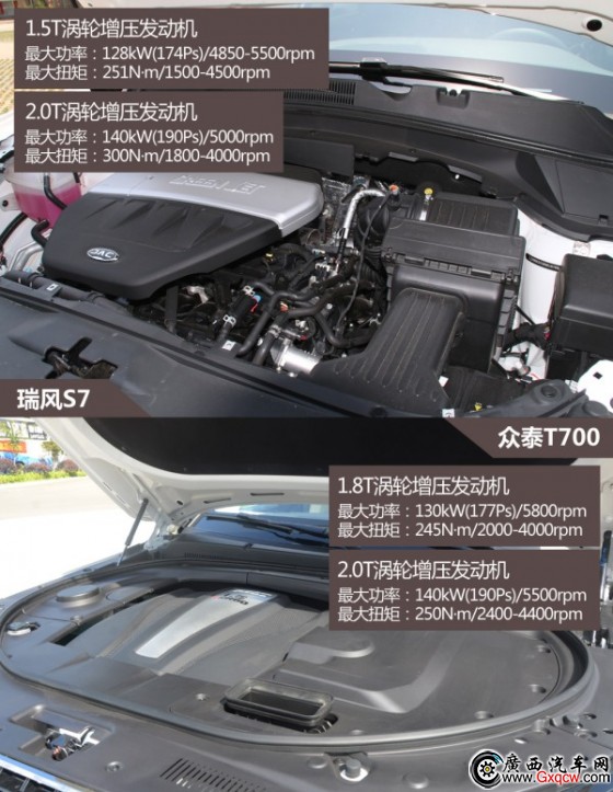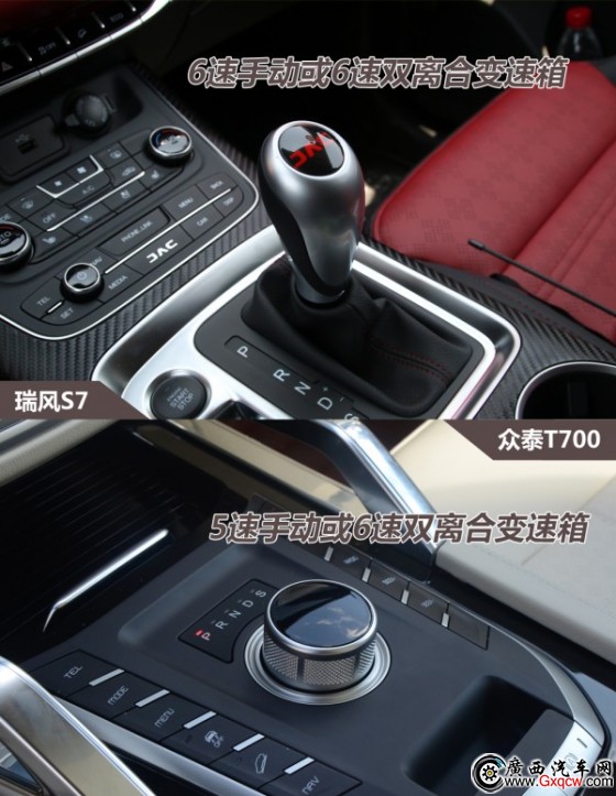 S7提供1.5T和2.0T兩種動力,傳動部分匹配6速手動或6速雙離合變速箱。眾泰T700搭載1.8T和2.0T兩種動力,與1.8T車型匹配的為5擋手動或者6擋雙離合變速箱,而2.0T匹配的只有6速雙離合變速箱。