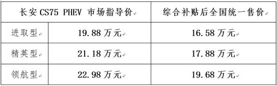 2018年9月12日,長(zhǎng)安新能源在上海1862老船廠榮耀推出“強(qiáng)者 自出眾”——智慧混動(dòng)SUV創(chuàng)行者長(zhǎng)安CS75 PHEV。此次上市的CS75 PHEV共計(jì)3款車(chē)型,市場(chǎng)指導(dǎo)價(jià)為19.88萬(wàn)元-22.98萬(wàn)元,綜合補(bǔ)貼后全國(guó)統(tǒng)一售價(jià)為16.58萬(wàn)元-19.68萬(wàn)元。