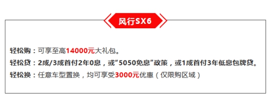 據(jù)了解,距離新車上市還將有一段時間。在新車正式與消費者見面前,如果有急切購車需求的用戶,東風風行現(xiàn)款風行SX6全系車型也貼心地為消費者推出了三重購車好禮。