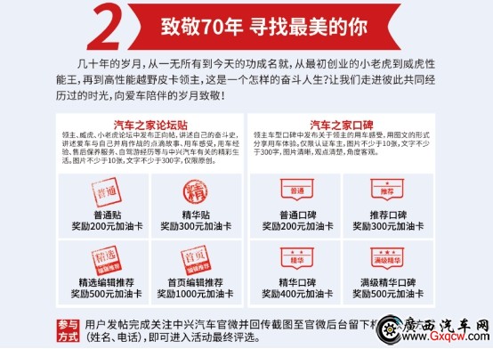 向愛車陪伴的歲月致敬,向中興汽車70年致敬!在活動期內(nèi),中興汽車?yán)嫌脩艨梢酝ㄟ^廣西汽車網(wǎng)中興領(lǐng)主論壇、威虎論壇、小老虎論壇發(fā)布正向論壇帖講述自己的奮斗史,也可分享與愛車并肩作戰(zhàn)的點(diǎn)滴故事、用車感受、用車經(jīng)驗(yàn)、售后保養(yǎng)服務(wù)、自駕游經(jīng)歷等精彩瞬間。同時,也可在廣西汽車網(wǎng)車型口碑發(fā)布關(guān)于領(lǐng)主的用車感受(動力、油耗、空間、外觀、操控等),用圖文的形式分享用車體驗(yàn)(詳見中興汽車官網(wǎng)),最終根據(jù)論壇貼效果與口碑效果獎勵加油卡。