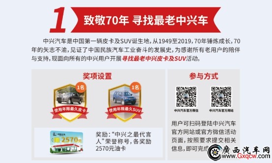 中興汽車是中國第一輛皮卡及SUV 誕生地,從1949年發(fā)展至今,歷經(jīng)70年錘煉成長,70年矢志不渝,中興汽車見證了中國民族汽車工業(yè)奮斗的發(fā)展史。為感謝老用戶70年的陪伴與支持,現(xiàn)面向所有的中興用戶開展尋找最老中興皮卡(使用年限最久),最老中興SUV(使用年限最久)活動。在活動期內(nèi),中興汽車用戶可以通過店頭報名與線上報名兩種方式參與活動(詳見中興汽車官網(wǎng)),最終按照評選標(biāo)準(zhǔn)選出最老中興皮卡及最老中興SUV各1輛,并授予車主“中興之最代言人”榮譽(yù)稱號,同時獎勵2570元加油卡。