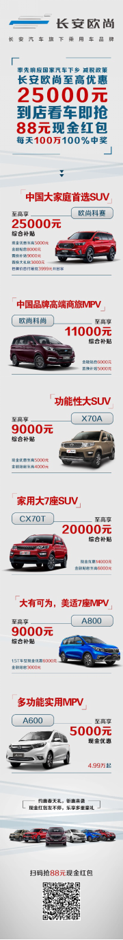 此外,除了現(xiàn)金紅包,長(zhǎng)安歐尚汽車的另一項(xiàng)鉅惠福利活動(dòng)——“汽車下鄉(xiāng)”仍在繼續(xù)。長(zhǎng)安歐尚汽車全系主力車型——科賽、科尚、X70A、A600、CX70T、A800在內(nèi)的多款主力車型均有不同程度的優(yōu)惠活動(dòng),讓廣大消費(fèi)者享受實(shí)實(shí)在在的購(gòu)車福利。更多優(yōu)惠詳情,請(qǐng)參見(jiàn)下圖