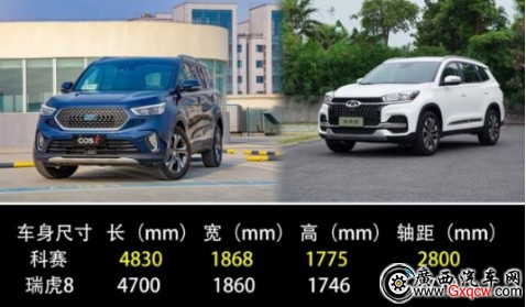 更大的空間意味著擁有更多的承載能力,我們來看一下這兩款車的尺寸參數(shù)對比。長安歐尚科賽長寬高為4830*1868*1775mm,軸距為2800mm,瑞虎8車為4700*1860*1746mm,軸距2710mm。從最直觀的尺寸數(shù)據(jù)對比看得出,歐尚科賽顯然更寬敞。