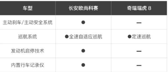 駕車出行首重安全。選擇私家車其安全性也非常重要。在安全性方面,歐尚科賽配有同級領(lǐng)先的ACC全速自適應(yīng)巡航配置,可實現(xiàn)不踩油門踏板和制動踏板自行跟隨前車行駛,再配以全速自適應(yīng)雷達(dá)、車道偏離預(yù)警、后視鏡集成全景影像攝像頭等智能輔助系統(tǒng),在智能安全性方面可謂誠意滿滿。而對于瑞虎8,比長安歐尚科賽少了主動剎車/主動安全系統(tǒng)、發(fā)動機啟停技術(shù)、內(nèi)置行車記錄儀等安全配置,更遜一籌。