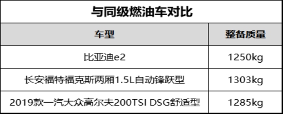 比亞迪e2的整車長寬高分別為4240/1760/1530mm,整備質(zhì)量卻只有驚人的1250kg。這是一個(gè)什么概念呢,我們不妨對比來看: