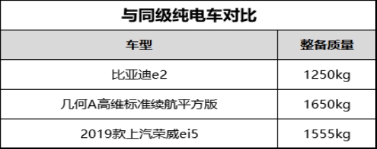 與同級別續(xù)航水平的純電動(dòng)車相比——吉利新推出的純電動(dòng)車型幾何A高維標(biāo)準(zhǔn)續(xù)航平方版,整備質(zhì)量為1650kg;2019款上汽榮威Ei5,整備質(zhì)量也達(dá)到了1555kg——應(yīng)該說,e2的輕量化水平是遙遙領(lǐng)先的。