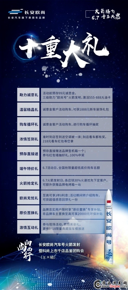 2019年還未過半,長安歐尚汽車就已連續(xù)刷爆“朋友圈”。命名中國首枚民營軌道級運(yùn)載火箭、發(fā)布全新品牌戰(zhàn)略及三款全新車型、發(fā)布中國品牌高端商旅MPV——科尚自動擋車型等等大動作在朋友圈掀起一股“浪潮”。近日,長安歐尚汽車開展了以“火箭騰飛 千店共惠”為主題的長安歐尚汽車號火箭發(fā)射暨科尚上市千店品鑒團(tuán)購會活動。屆時,長安歐尚科尚自動擋將在全國“千店”終端門店開辦大規(guī)模用戶品鑒會。值得一提的是,這款人氣車型在近日舉辦的重慶車展發(fā)布即收獲20000臺大單,刷新了國貨精品MPV單日銷量記錄。