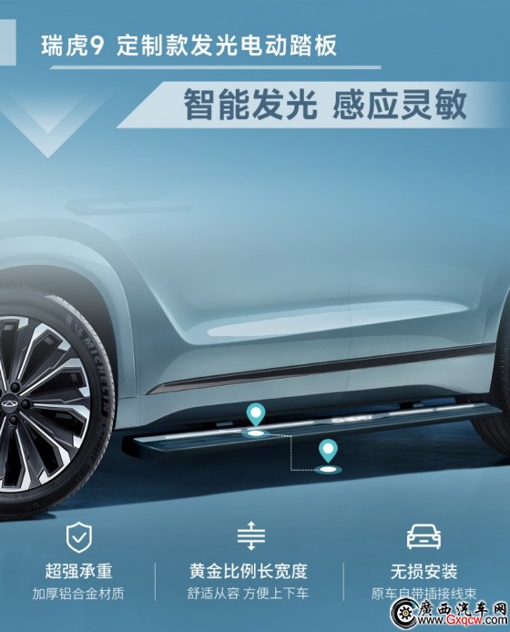 智駕體驗(yàn),品質(zhì)見證。瑞虎9定制款發(fā)光電動踏板采用炫酷燈帶智慧點(diǎn)亮功能,璀璨光芒極富辨識度,擁有顏值的同時(shí)更享高品質(zhì),讓愛車瞬間個(gè)性十足;智能感應(yīng)自動收縮,雙向安全防夾,車輛速度超過5km/h踏板自動收縮,更加人性化,讓每一次上下車更顯從容,安全靈動,對于有老人、孩子的家庭出行,原廠側(cè)踏的人性化設(shè)計(jì)顯得更加方便、人性化,用安全守護(hù)每一處細(xì)節(jié);加厚鋁合金材質(zhì),原廠品質(zhì)保障,超強(qiáng)承重,使用壽命更長久;原車自帶插接線束,無損安裝更美觀,高級感瞬間拉滿。顏值與實(shí)力并存,讓上下車成為一種舒適和享受,用滿滿儀式感助力美好車生活。