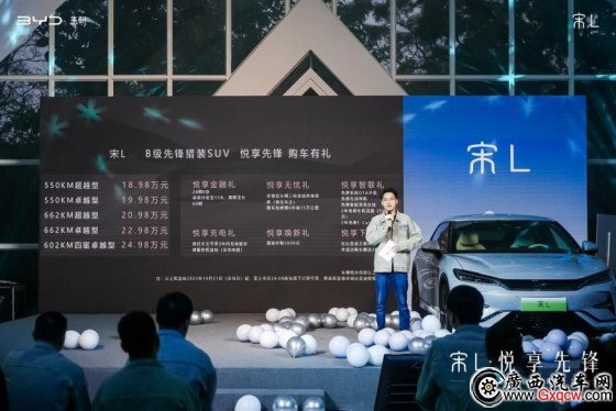 比亞迪王朝網(wǎng)銷售事業(yè)部南部戰(zhàn)區(qū)-廣西大區(qū)運(yùn)營(yíng)經(jīng)理黃耀俊也為大家揭曉了本次宋L的車型以及價(jià)格,本次新車共推出4款后驅(qū)版車型和1款四驅(qū)版車型,官方指導(dǎo)價(jià)18.98萬元——24.98萬元。此外,還包括悅享金融禮、悅享煥新禮等在內(nèi)的六大上市權(quán)益,