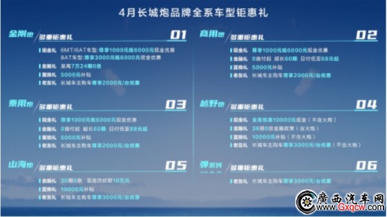 同時(shí),購(gòu)買山海炮還可尊享10000元置換補(bǔ)貼、36期0息等政策;購(gòu)買越野炮,尊享限時(shí)優(yōu)惠10000元(不含火炮)、置換補(bǔ)貼10000元(不含火炮)、金融貼息36期0息(含火炮)等鉅惠福利;購(gòu)買乘用炮、商用炮、金剛炮6MT/6AT尊享限時(shí)優(yōu)惠1000元抵6000元,金剛炮8AT享3000元抵6000元,以及置換補(bǔ)貼5000元等超值優(yōu)惠。此外,山海炮、彈系列及越野炮(不含火炮),長(zhǎng)城車主購(gòu)車可享3000元的優(yōu)惠政策;乘用炮、商用炮、金剛炮,長(zhǎng)城車主購(gòu)車則可享2000元的政策福利。圓夢(mèng)基金與車型政策可疊加使用。