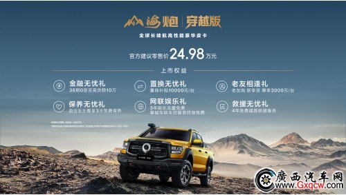 山海炮穿越版定位全球長續(xù)航高性能豪華皮卡,基于全球領(lǐng)先的智能專業(yè)越野坦克平臺打造,為全場景穿越而生,是一臺可以帶一家人舒適出行,從容征服全球山海的高端皮卡,以無與倫比的穿越能力、出眾的拖掛能力、百變的改裝能力、全場景休閑適應(yīng)能力,成就真正的戶外之王。