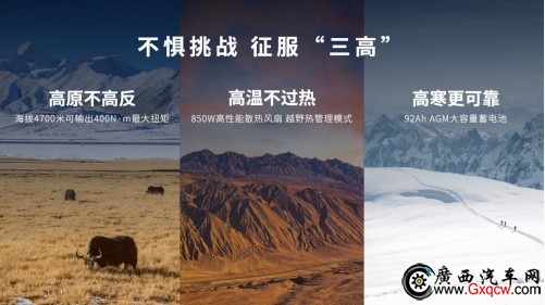 2.4T越野炮性能全面進(jìn)階,輕松應(yīng)對(duì)高原、高溫、高寒等極端環(huán)境考驗(yàn)。高原不高反,海拔4700米高原仍可輸出400N·m最大扭矩,高原穿越無壓力;高溫不過熱,專項(xiàng)配備850W高性能散熱風(fēng)扇,匹配行業(yè)首創(chuàng)越野熱管理模式,炎炎夏日即使大負(fù)載長(zhǎng)途穿越,也無需擔(dān)心;可選裝硅油風(fēng)扇,實(shí)現(xiàn)發(fā)動(dòng)機(jī)運(yùn)行的動(dòng)力最優(yōu)、油耗最優(yōu)、耐久最優(yōu);高寒更可靠,采用同級(jí)領(lǐng)先的AGM大容量蓄電池,容量高達(dá)92Ah,電容穩(wěn)定性、低溫可靠性更高,即使面對(duì)北方寒冬,冷啟動(dòng)也可以一鍵搞定!