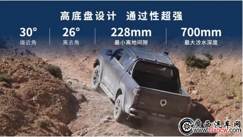 另外,新車采用高底盤設(shè)計(jì),接近角30°、離去角26°,搭配360全景環(huán)視+透明底盤功能,通過性超強(qiáng),不懼戶外惡劣路況。預(yù)留多個(gè)改裝接口,原廠自帶3噸拖掛資質(zhì)和拖車防擺功能,一車多用,拓展多樣生活。