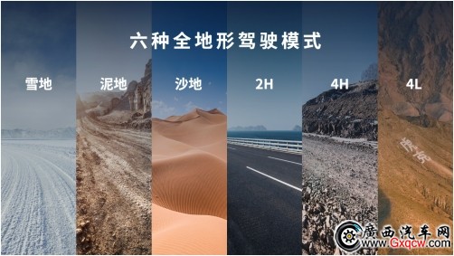 新車配備雪地、泥地、沙地、2H、4H、4L六種全地形駕駛模式,可以輕松勝任全天候、全路況、全場(chǎng)景的艱險(xiǎn)征途;配備蠕行模式、坦克轉(zhuǎn)彎,并同級(jí)獨(dú)有越野專家模式,戶外穿越更隨心。