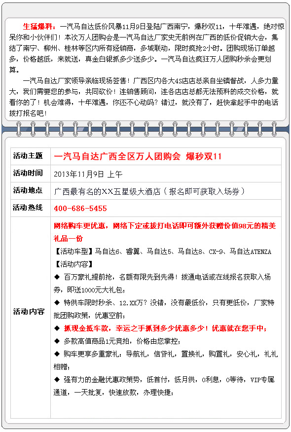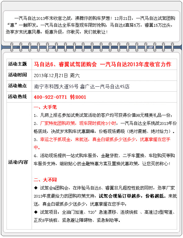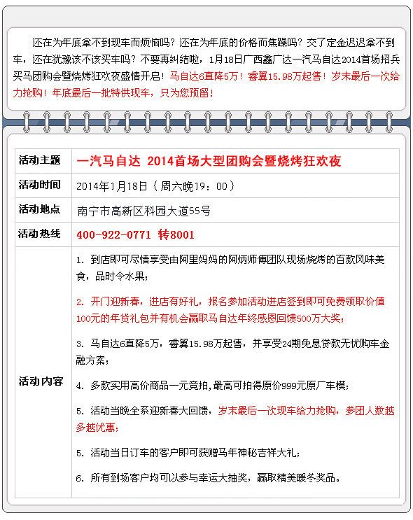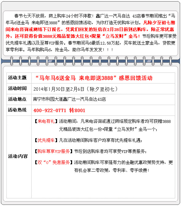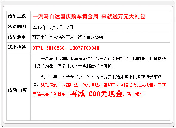 【團(tuán)購(gòu)亮點(diǎn)】:本次搶購(gòu)活動(dòng)由廣西汽車(chē)網(wǎng)全程操辦,機(jī)會(huì)不容錯(cuò)過(guò)!到店簽到均有精美禮品相送!
