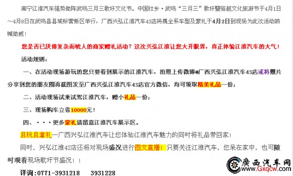 南寧江淮汽車強(qiáng)勢(shì)助陣武鳴三月三歌圩文化節(jié)。中國壯鄉(xiāng)·武鳴“三月三”歌圩暨駱越文化旅游節(jié)于4月1日~4月8日在武鳴縣縣城標(biāo)營新區(qū)舉行,廣西興弘江淮汽車4S店將攜全系車型及豪禮于4月2日到開幕式現(xiàn)場(chǎng)為此次活動(dòng)吶喊助威!