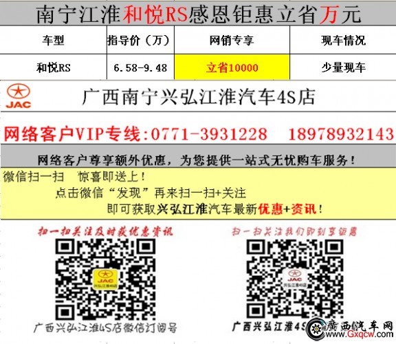南寧江淮和悅RS感恩鉅惠力省10000!現(xiàn)撥打廣西興弘江淮汽車4S店銷售熱線訂購和悅RS即為您省下包括貼膜、地膠、腳墊、香水座、方向盤鎖、座椅套 貸款利息等等萬元花銷。