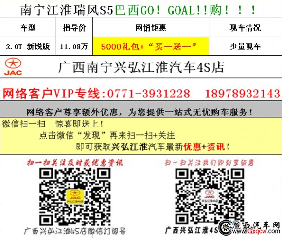 南寧江淮瑞風S5-巴西GO!GOLA !購。!現(xiàn)到店購車廠家直送5000運動大禮包!更可參與“幸運七星彩 月送七臺車”活動!詳詢:0771-3931228