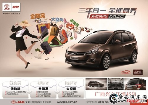 江淮“和悅RS”不僅擁有大空間、高配置、好品質(zhì)的產(chǎn)品特點,同時也將高功率、低油耗、強(qiáng)效能的優(yōu)勢發(fā)揮的