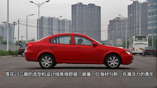 雖然車身并不龐大,但從側面看,蓮花L3三廂的造型和設計線條很舒展,就像一位身材勻稱、充滿活力的青年,相對較長的發(fā)動機艙使車型更趨向跑車風格,微微上翹的尾部有一種躍躍欲試向前沖的感覺,為整個側面造型增添了動感時尚的元素。