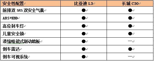 安全配置方面,比亞迪L3與長城C30都全系標(biāo)配了前排SRS雙安全氣囊、安全帶未系報警系統(tǒng)、高位剎車燈、ABS+EBD、兒童安全鎖、可潰縮吸能轉(zhuǎn)向柱等主流安全配置,L3還增加了潰縮吸能式制動踏板,為車主提供了完備的安全防護。此外,前大燈高度可調(diào)等緊湊型車中少有的配置,在L3上也成了標(biāo)配。自動開啟的感應(yīng)大燈、倒車可視系統(tǒng)等科技配置也一應(yīng)俱全,這也是長城C30所不具備的。