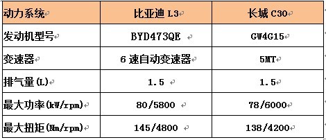 動力方面,比亞迪L3配備的是擁有VVL(可變氣門升成)技術(shù)的BYD473QE 全鋁合金發(fā)動機, *大功率為80KW/5800 rpm, *大扭矩為145 Nm/4800 rpm,完全能滿足日常需求。而長城C30配備的GW4G15發(fā)動機,*大功率78KW /6000 rpm,*大扭矩為138 Nm /4200 rpm,在動力上比亞迪L3也要略占優(yōu)勢。