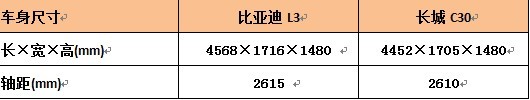比亞迪全新L3 6速自動擋全車尺寸為4568×1716×1480mm,軸距2615mm,后排空間寬裕,無論是頭部還是腿部空間都十分充裕,而長城C30 車身尺寸為4452×1705×1480mm,軸距為2610mm,在空間上比亞迪L3要優(yōu)于長城C30。