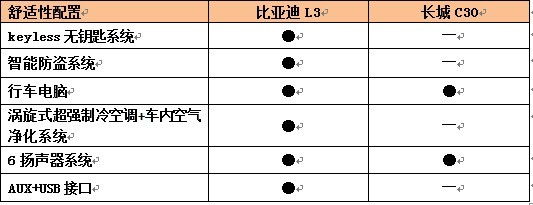而行車電腦、電動調(diào)節(jié)外收后視鏡以及行李箱電動開啟功能等長城C30上裝配的配置,在L3上同樣一一具備。此外與長城C30相比,L3在娛樂性上也略勝一籌,在配備有CD音響系統(tǒng)和USB接口的情況下,多了AUX接口,使得數(shù)據(jù)傳輸更加便捷,并且還提供DVD影音娛樂+方向盤音響控制系統(tǒng),配合6揚聲器系統(tǒng)使車內(nèi)的視聽感受變得更加完美,而長城C30僅在頂配車型上才有6揚聲器。在舒適性配置方面L3同樣占優(yōu),防潛滑高級打孔豪華座椅、渦旋式超強制冷空調(diào)都為其加分不少。