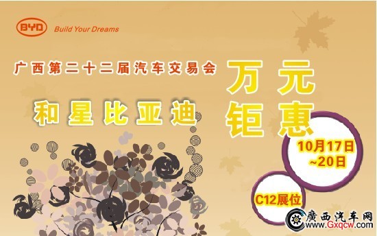10月17日-10月20日,廣西第二十二屆汽車交易會(huì)震撼來襲!南寧和星比亞迪推出安吉車展萬元鉅惠活動(dòng),只要您來到南寧和星比亞迪C12展位賞車訂車,即可享受車展促銷價(jià)格購(gòu)車,鉅享實(shí)惠!訂購(gòu)任一款車型即可尊享車展團(tuán)購(gòu)價(jià),每款享受超值鉅惠!活動(dòng)熱線:0771-4899566