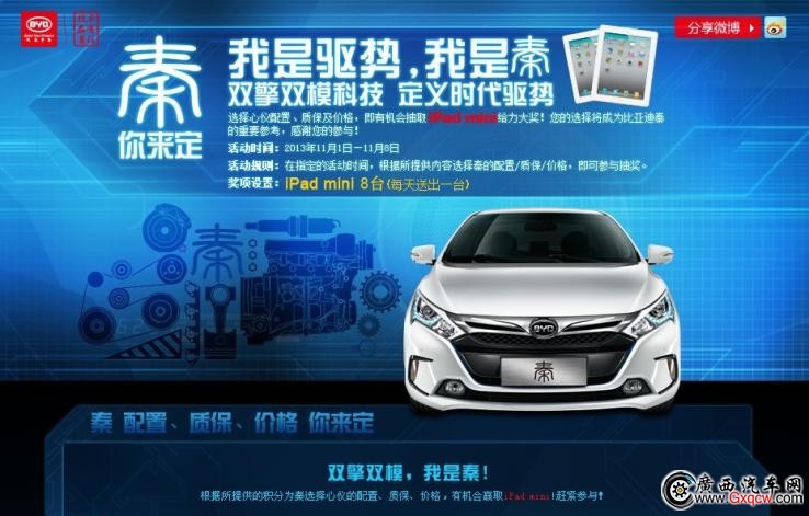 “秦你來定”活動(dòng)即網(wǎng)友可在活動(dòng)網(wǎng)站上選擇心儀的配置、質(zhì)保及價(jià)格,而網(wǎng)友的選擇將成為比亞迪秦量產(chǎn)車型的重要參考,消費(fèi)者歡迎的配置很有可能搭載到最終上市的秦車型上。