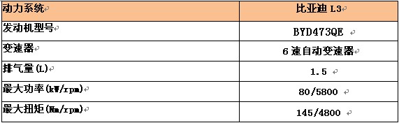 動(dòng)力方面,比亞迪L3配備的是擁有VVL(可變氣門升成)技術(shù)的BYD473QE 全鋁合金發(fā)動(dòng)機(jī), *大功率為80KW/5800 rpm, *大扭矩為145 Nm/4800 rpm,綜合工況下百公里綜合油耗最低僅6.2L,并可享受企業(yè)3000元補(bǔ)貼。