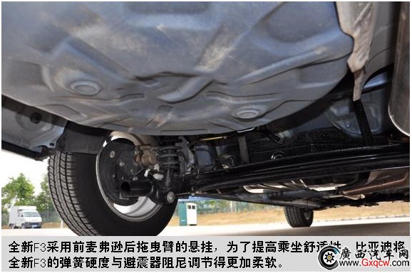 全新F3前麥弗遜后拖曳臂的懸掛形式延續(xù)了現(xiàn)款車型,為了提高乘坐舒適性,比亞迪將全新F3的彈簧硬度與避震器阻尼調(diào)節(jié)得更加柔軟,讓其在保證并線和過彎擁有足夠支撐力的同時(shí),也為車內(nèi)駕乘人員過濾掉了路面上大量多余的顛簸。