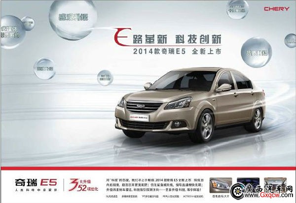 奇瑞全新產(chǎn)品體系已經(jīng)梳理完成,2014款奇瑞E5日前升級呈現(xiàn)。8月2日,2014款奇瑞E5正式上市。經(jīng)過三大升級,52項(xiàng)改進(jìn),2014款奇瑞E5外觀更加時(shí)尚大氣,科技配置更加齊全,駕乘體驗(yàn)更為舒適。2014款奇瑞E5覆蓋1.5L、1.8L兩種排量,售價(jià)從6.58萬―8.48萬。