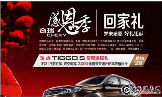 在2013年12月25日至2014年1月31日專門針對訂購全新瑞虎5的消費者推出了一項名為“瑞虎5春節(jié)出行補貼”的回饋活動。在這項活動中,那些在1月31日前(含)預(yù)定了瑞虎5,卻因車源問題不能在2月1日前提車的消費者,將享受到2000元的春節(jié)期間交通補貼”。