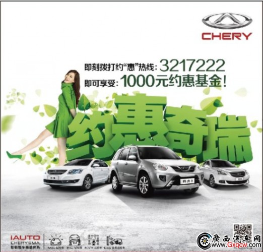 TIGGO瑞虎3、風云2和E5是奇瑞汽車的暢銷車型。動力與節(jié)油兼優(yōu)的經(jīng)典SUV+時尚動感家轎+科技家轎典范的搭配,結合相應的優(yōu)惠政策,帶給消費者實實在在的價格讓利。在享受產(chǎn)品優(yōu)惠的同時,通過撥打“約惠熱線”:0772-3217222