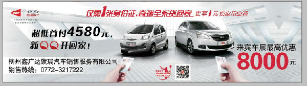 2013夏季首場汽車交易會將于6月14-16日將在來賓市行政中心廣場隆重舉行,汽車交易會期間,奇瑞汽車各車型均有優(yōu)惠,各種超低價等著您,還在等什么?只需一張身份證,奇瑞等你來開走!