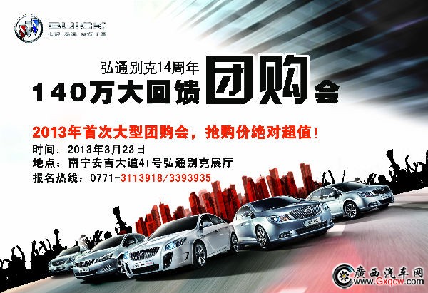 安吉弘通別克4S店,將于3月23日開展“弘通別克14周年140萬大回饋”大型團購活動,屆時,別克各款車型均有大幅度優(yōu)惠,送團購特大禮包,更有千元家電任您選,我們承諾為您提供您最想要的更低的實際售價!