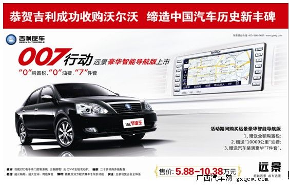 近日,編者從吉利方面獲悉,遠(yuǎn)景豪華智能導(dǎo)航版即將上市,其配備的GPS導(dǎo)航、可視倒車?yán)走_(dá)、真皮坐椅,給廣大用戶提供了更具個(gè)性化、更豐富的產(chǎn)品選擇。此外,我司還為新車型上市量身定做了送購置稅、油費(fèi)、汽車裝潢套裝等近萬元優(yōu)惠的“007”行動(dòng)。