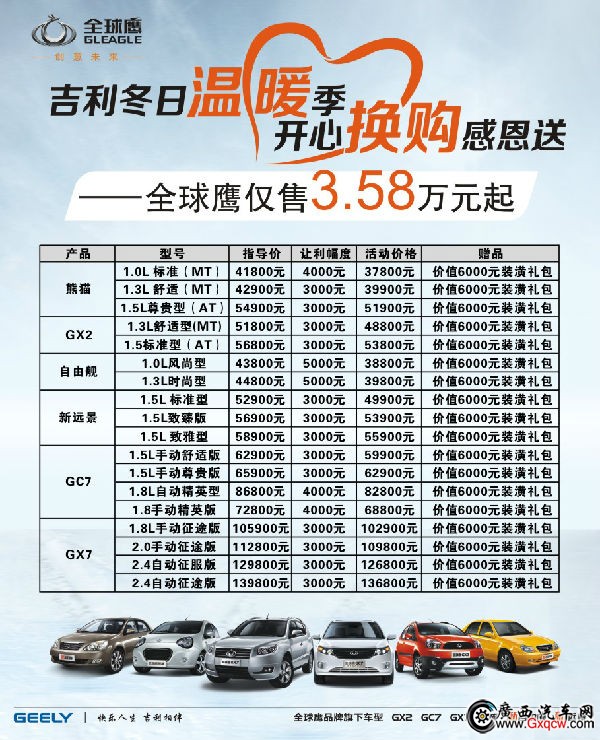 南寧開(kāi)河**鷹4S店將在11月17日“開(kāi)展吉利冬日溫暖季 開(kāi)心換購(gòu)感恩送”特惠專(zhuān)場(chǎng)活動(dòng),活動(dòng)當(dāng)天購(gòu)買(mǎi)吉利**鷹旗下任意一款車(chē)型,即可車(chē)展的優(yōu)惠政策,提前享受?chē)?guó)際車(chē)展的優(yōu)惠價(jià),還可先后贈(zèng)送價(jià)值6000元裝潢大禮包。