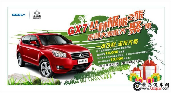 **鷹GX7叢林極限試乘試駕體驗活動倒計時2天!親,您還在猶豫什么? 想體驗吉利首款超五星安全SUV―**鷹GX7各項卓越性能,6月2日報名參加GX7大型戶外山林越野試乘試駕會吧,還有開心農家樂,讓您嗨不停!吉利**鷹、帝豪全系大“聚惠”,廠家直銷大型團購會,僅虧一天!,超值特惠團團賺!凡吉利老車主增換購**鷹GX7*高可享受10000元優(yōu)惠!購帝豪EC7自動檔裸車現金直讓6000元。!