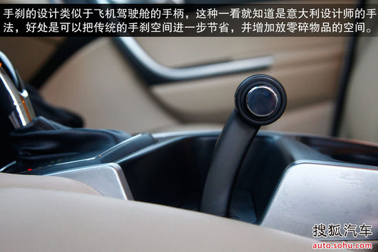 手剎:樣式讓人想起飛機(jī)駕艙在自動(dòng)擋位的前方有運(yùn)動(dòng)啟動(dòng)鍵和ESP車輛穩(wěn)定控制鍵,以幫助提高加速和安全的需要。但這都不是最耀眼的地方,在變速桿的后方和中央扶手盒的中間位置,一種非常新穎的手剎裝置,這個(gè)類似于飛機(jī)駕駛艙的手柄是通過拇指按住按鈕來提拉起來操作的,而在開起來時(shí)候它又是隱藏在控制臺(tái)的下面,這種設(shè)計(jì)一看就知道是意大利設(shè)計(jì)師的手法,好處是可以把傳統(tǒng)的手剎空間進(jìn)一步節(jié)省,并增加了放零碎物品的空間。