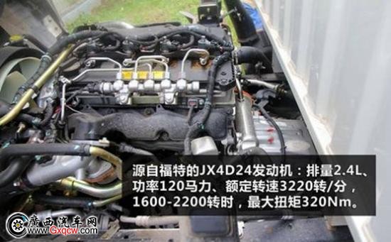凱銳800發(fā)動(dòng)機(jī)不再沿用早期五十鈴493技術(shù)的發(fā)動(dòng)機(jī)平臺(tái),啟用了JX4D24電控高壓共軌發(fā)動(dòng)機(jī)。配合可變截面渦輪增壓器,通過外置廢氣再循環(huán)系統(tǒng)達(dá)到國(guó)四排放標(biāo)準(zhǔn)。該款發(fā)動(dòng)機(jī)來(lái)源于福特經(jīng)典的PUMA發(fā)動(dòng)機(jī)技術(shù),與路虎衛(wèi)士、新全順?biāo)ヅ涞陌l(fā)動(dòng)機(jī)系出同門,2.4L排量即可達(dá)到120馬力的凈功率,額定轉(zhuǎn)速達(dá)到3200轉(zhuǎn)/分,在1600-2200轉(zhuǎn)時(shí),可提供320Nm的*大扭矩。