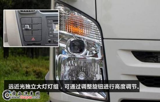 遠(yuǎn)近光獨(dú)立的大燈燈組,近光燈采用了透鏡式。大燈組可以通過駕駛室內(nèi)的調(diào)整旋鈕進(jìn)行高度調(diào)節(jié),方便駕駛員在空、重車時(shí)對(duì)燈光的照射角度進(jìn)行修正,避免重車時(shí)燈光仰起而影響對(duì)方來(lái)車的視線。這也是一種安全和禮貌行車的表現(xiàn),畢竟與人以便也就是對(duì)自己的保護(hù)。