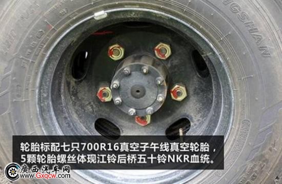 后橋采用了五十鈴NKR技術(shù)的加強(qiáng)橋,輪胎標(biāo)配七只700R16真空子午線真空輪胎,全部帶有動(dòng)平衡鉛塊,5顆輪胎螺絲將江鈴凱銳800后橋的五十鈴NKR血統(tǒng)表現(xiàn)得一覽無(wú)遺。