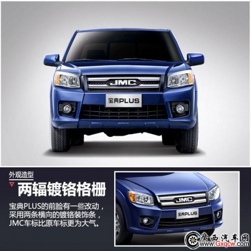 寶典PLUS的前臉有一些改動(dòng),采用兩條橫向的鍍鉻裝飾條,JMC車標(biāo)比原車標(biāo)更為大氣,配合黑色蜂窩式進(jìn)氣格柵,使得前臉與寶典形成明顯差異。寶典PLUS尾部進(jìn)行細(xì)節(jié)上的處理,除了尾部門把手周圍增加了一些裝飾外,細(xì)節(jié)主要還是體現(xiàn)在一款樣式新穎并與外繩鉤一體的龍門架上。