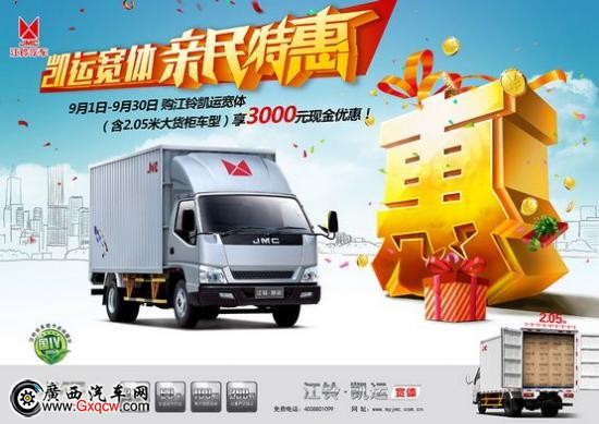 近日,小編走訪廣西江鈴汽車(chē)了解到, 截止9月30日到安吉到店購(gòu)江鈴凱運(yùn)寬體車(chē)型即可享受交2000元訂車(chē)款抵5000元購(gòu)車(chē)優(yōu)惠。優(yōu)惠倒數(shù)計(jì)時(shí),歡迎廣大好友到廣西江鈴安吉4S店選購(gòu),咨詢(xún)熱線:0771-3119811.