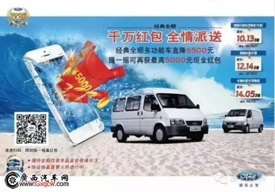 中秋將至,江鈴福特全順車系提前享豪禮,即日起至9月30日到廣西江鈴4S店購車即可享受1500元現(xiàn)金優(yōu)惠,同時(shí),參與福特全順官方微信“搖獎(jiǎng)”活動(dòng)*高可搖5000元紅包,紅包金額可直接抵扣車款,百分百中獎(jiǎng),抓住機(jī)會(huì),你還等什么呢?咨詢熱線:0771-3119811.