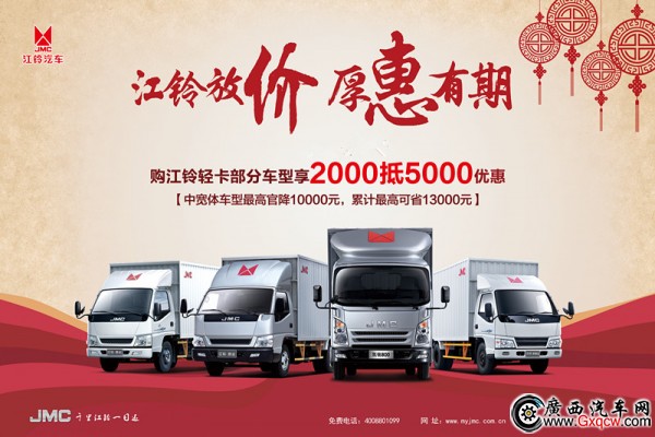 據(jù)獲悉,即日起至5月31日到廣西江鈴安吉4S店購江鈴輕卡即可享受預(yù)交2000定車款抵5000元購車限時(shí)搶購,歡迎感興趣的朋友來店選購,咨詢熱線:0771-3119811.